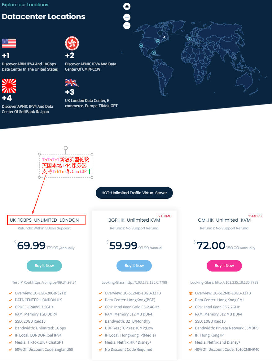 关于ToToTel ,ToToTel是VmShell INC美国公司旗下的全球云计算品牌(由于是美国公司,请遵守美国法律要求的服务内容),其中覆盖了香港CMI(三网优化),英国伦敦1Gbps不限流量服务器 ,美国全媒体IP(电信/联通优化)10Gbps基础网络,自2021年成立至今已超过四年的老牌IDC基础网络提供/服务商,ToToTel采用集成度更高的PVE云服务器架构,简洁高效,