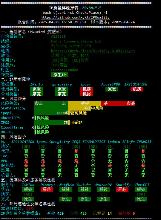 3,IP质量检测脚本(结果如下): bash <(curl -Ls IP.Check.Place)