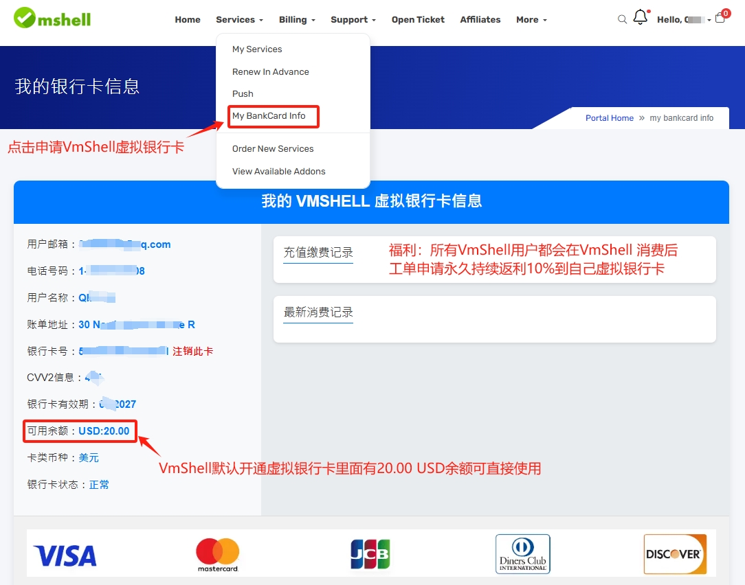 简单来说:由于VMSHELL-虚拟银行卡目前是给VMSHELL用户送的福利卡:您所消费购买服务器产品的所有费用,我们返佣10%给您,您仅需要具备VMSHELL的服务器产品价值20.00USD以上,同时再充值25.25 USD办卡(卡片默认余额:20.00usd在里面);即可享受所有用户消费的10%返现规则(暂时不接受任何充值到银行卡的行为),专业的发卡平台正在开发中!