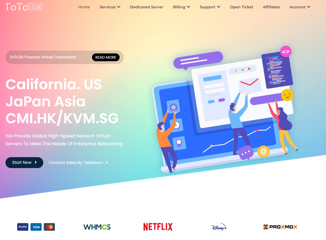 关于ToToTel ,ToToTel是VmShell INC美国公司旗下的全球云计算品牌(由于是美国公司,请遵守美国法律要求的服务内容,特别在打击盗版方面),其中ToToTel提供的全线产品中覆盖了香港CMI(三网优化),香港BGP(移动优化),日本BGP(移动/联通优化),美国全媒体IP(电信/联通优化)10Gbps基础网络,自2021年成立至今已超过3年的老牌IDC基础网络提供/服务商,ToToTel采用集成度更高的PVE云服务器架构,拥有服务器镜像功能,方便用户对云服务器的整体迁移到阿里云、私有云、ORACLE/AZ/AWS等各种云整体迁移!
