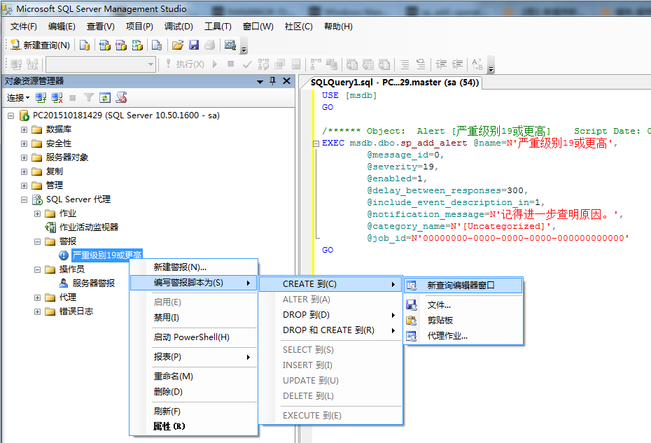 当然你也可以通过sp_add_alert的系统存储过程来创建。关于这个存储过程的文档在这里:https://msdn.microsoft.com/zh-cn/library/ms189531.aspx 或者直接从SSMS里创建,如插图7所示。