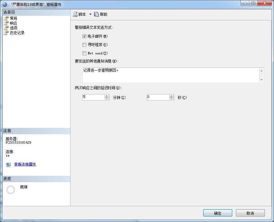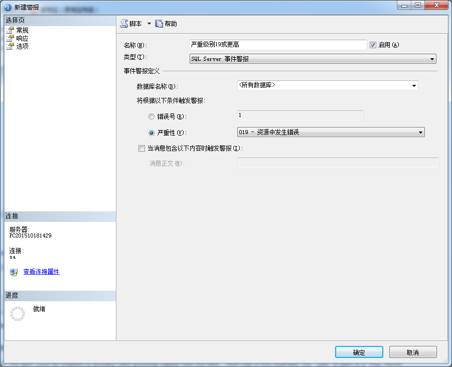 在新建警报对话框里的下拉框里的严重级别只是对于SQL Server所有可能错误的可用严重级别(查看RAISERROR命令文档来了解更多:https://msdn.microsoft.com/zh-cn/library/ms178592.aspx )这些在19或更高级别的错误,需要DBA干预调查为什么会发生这个级别的错误。