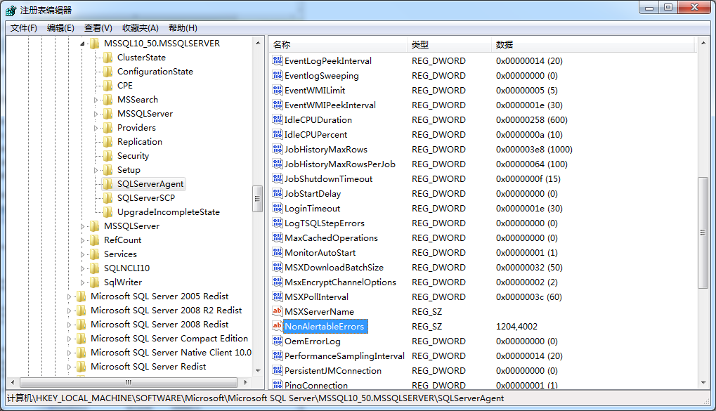 有意思的是你可以指定特定的错误信息从不触发。为了定义这样的错误,你必须人为更新服务器上的注册表。注册表是你特定实例上的。在HKEY_LOCAL_MACHINESOFTWAREMicrosoftMicrosoft SQL ServerMSSQL10_50.MSSQLSERVER下,你会找到SQLServerAgent,如插图8所示。