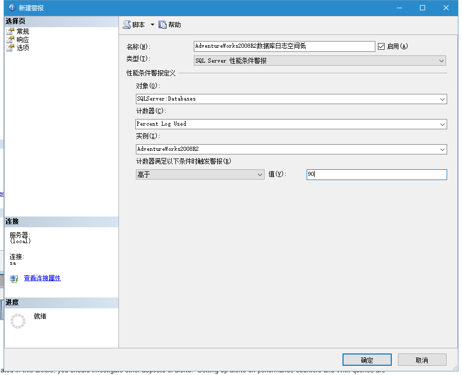 警报的第2个类型是 SQL Server性能条件警报。你可以给予性能计数器配置很多种类的警报。遗憾的是,你只能设置SQL Server的计数器,但这已经能让你自动监控你的系统。例如,在插图9里,当AdvantureWorks数据库的事务日志超过90%满时,你后收到警告的警报。一但你选择如插图4的选项,点击【响应】页来配置对这个警报对应采取的行动(如插图5所示)。你会看到你可以执行SQL Server代理作业(例如刚才提到的日志空间增长,或开始备份数据库),或提醒对应的操作员(例如我们刚才定义的操作员)。在这个例子里,当警报触发的时候,我们选择给“服务器警报”操作发送邮件。