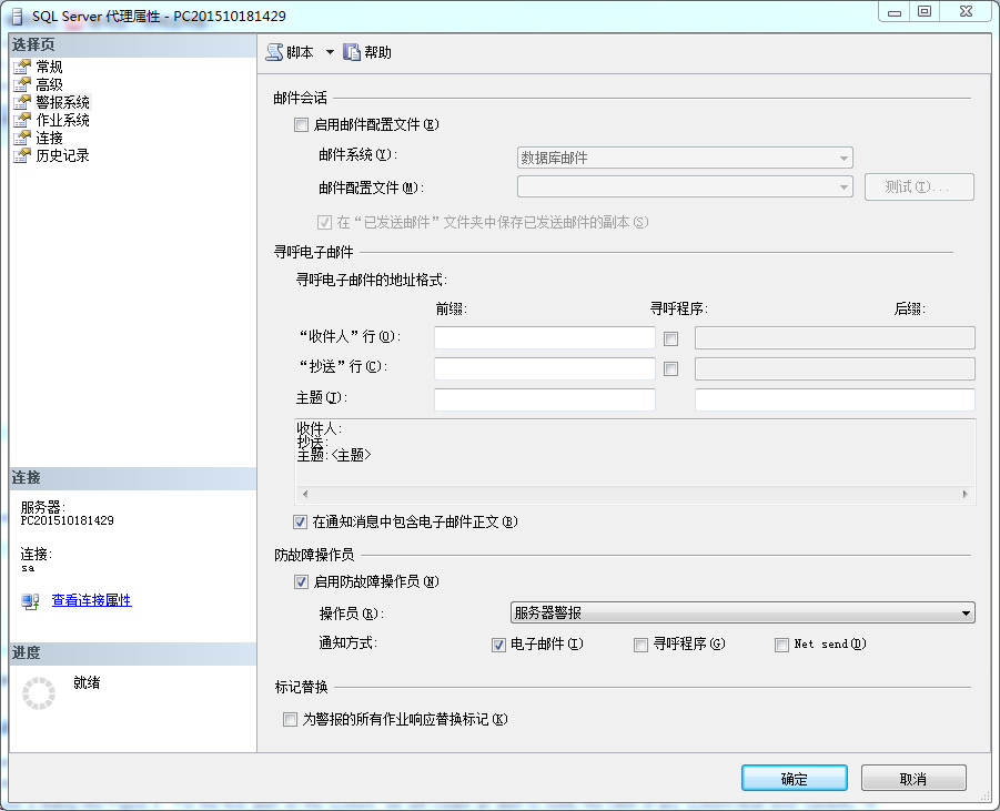 你在SQL Server代理属性对话框里定义防故障安全员(右击SQL Server代理,选择属性),在警报系统页。勾选启用防故障操作员,然后从列表里选择系统已经定义的操作员,如插图3所示。当完成选择后,点击【确定】。注意这页的其它选项会在下一篇的数据库邮件里谈到。